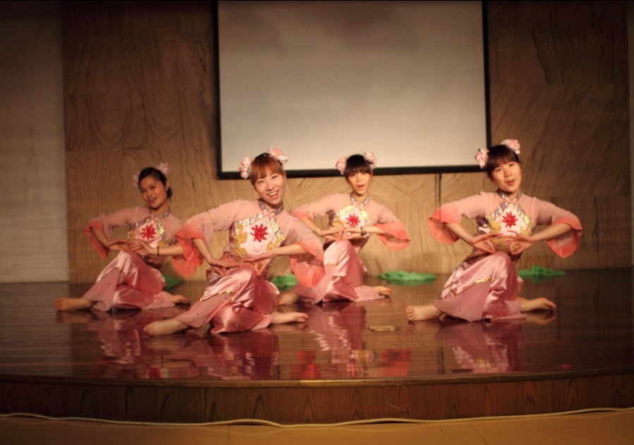 晚会以中国极具代表性的传统技艺——Chinese Kongfu开场。伟德bv国际体育广袤园武术协会的8位学生分为三组,依次出场,向观众展示了中国传统武术中长拳、南枝、南拳三大拳种的不同风采。长拳伸长舒展、南枝简练凶狠、南拳刚劲有力,每一个精彩动作都引来了观众的阵阵欢呼。随后,汕头大学的学生们带来了潮汕民族舞蹈,四位女生用柔美动人的舞姿向大家演绎了“出花园”的故事:从活泼可爱的小女孩成长为娇羞青春的美女,让观众拍案叫绝。