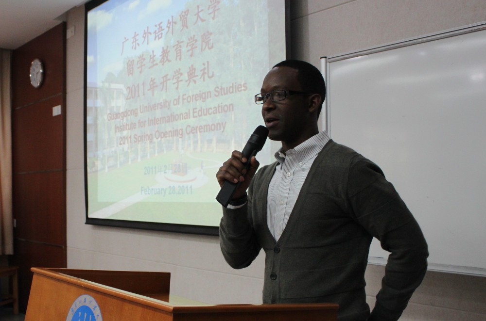 来自几内亚的本科四年级学生巴克作为学生代表讲话。他的讲话妙趣横生、感情真挚并从独特的角度介绍了他在广外学习汉语的快乐生活。最后他鼓励同学们在学习及生活上互相帮助。