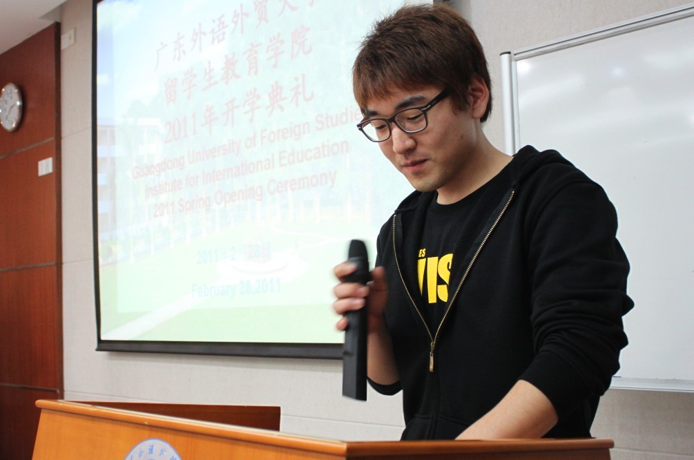 接着,来自韩国培材大学的交换生代表文耕一用流利的汉语,表达了他对广外和广州的喜爱,生动的演讲赢得了在场同学的阵阵喝彩。