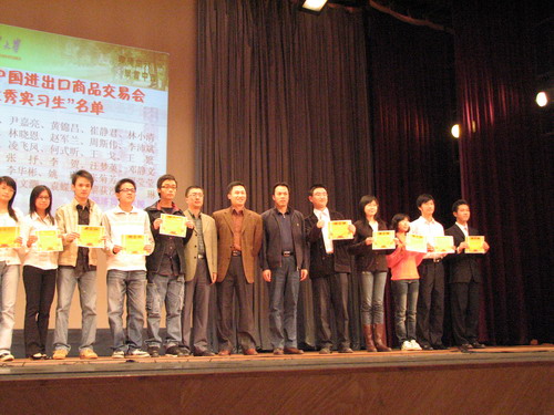 接下来,大会司仪宣读了本届广交会227名“优秀实习生”名单并由陈少伟科长、李和民副处长和康为茂副书记为获奖的各班代表颁奖。康老师表示:在广交会的实习中,经贸学院学子将专业特色与外语优势结合在一起,在实习的同时长知识、增才干,希望同学们在今后的学习中更能抓好专业知识的学习,争取得到更大的进步。