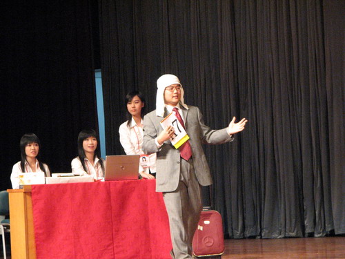 05金融3班的小品《广交办办堂》,让与会人员重温了广交会期间的趣闻趣事,广交会云集了世界各地的客商,不同肤色、不同民族、不同信仰的客商给经贸学子见识了来自世界各地的风情。