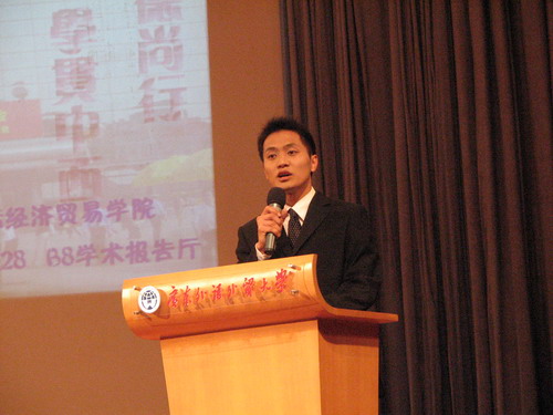 之后,由来自05级电子商务1班的刘炽光同学代表566名实习生作总结,他说:“感谢学校和学院给予我们实习的机会,通过实习,使我们的外交礼仪接待能力、英语会话能力和灵活处理突发事件的应变能力等都得到不同程度的提高,自身吃苦耐劳、无私奉献的精神也得到了锻炼。”