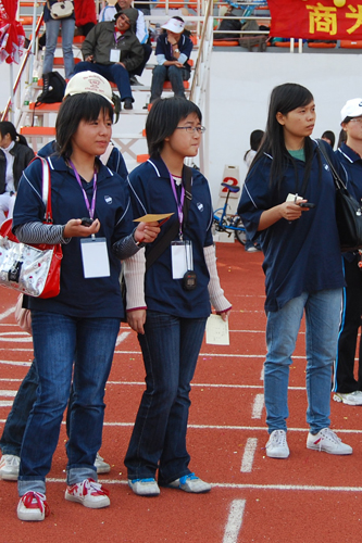 这群勤劳的工作人员是自愿报名充当校运辅助裁判的各班同学,他们的工作琐碎繁多。除了要处理跑道上的问题以外,他们还要在起点终点统计分数,安排好选手的检录。正是他们的努力,才使校运会更有秩序、有效率。