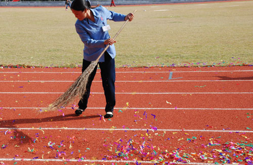 开幕式上飞舞的彩花,此时成为他们帚下的工作。挥动的扫帚,洒下的汗水,默默的背影是另一种支持,另一种奉献……