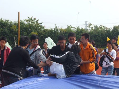 运动场边的阶梯看台是各个学院的大本营,各学院的拉拉队一直坚定地驻守在大本营,给场上的运动员加油打气。统一的服装,鲜艳的充气棒,响亮的口号、热情激昂的加油声……声声如春风般温暖了运动员们的心,如夏雷般激励着运动员的斗志,如烈火般燃烧了他们的激情。每一个代表队的成绩,有运动员们一半,也有拉拉队员的一半。“不怕苦,不怕累,只是希望你能拿个好名次!”一位同学如是概括拉拉队的精神。
