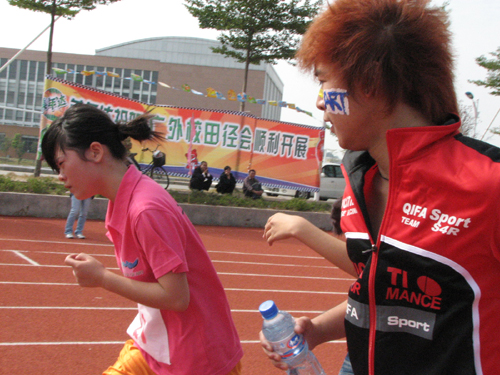 校运会还没有开始,田径场上的空气还没有升温,政管学院的两位女同学已推着自行车,带着运动员的鞋子,行走在通向比赛场地的路上;田径场上的辅助裁判和工作人员等等都已各就各位,开始投入紧张的工作。