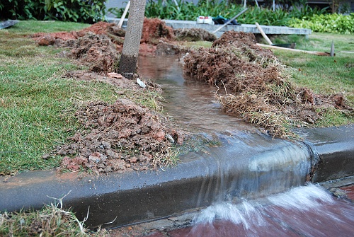 本网讯 11月24日下午,南校学生公寓八栋前的草地突然有水不断冒出,水漫溢到了校道上。大众物业广外南校区机电部得知情况后,立刻派工人进行处理。25日上午,就此情况,记者采访了正在紧张指挥施工的大众物业广外南校区机电部部长彭先斌。