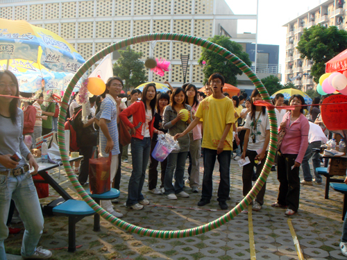 在团体轮番展示、节目精彩奉献同时,场地的另一边达到了游戏的高潮,趣味游戏吸引一大群观众排队参与。