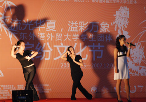 在第一段表演中,学术团体的风采展示生动有趣。理财协会一句 “你不理财,财不理你” 的诙谐口号引得观众一阵欢笑;“修身,治国,平天下”,身着统一职业装的外交协会会员一出场就让观众眼前一亮。由TGC协会带来的NEW JAZZ的舞蹈动感十足,用热情诠释了广外学子的青春与活力。
