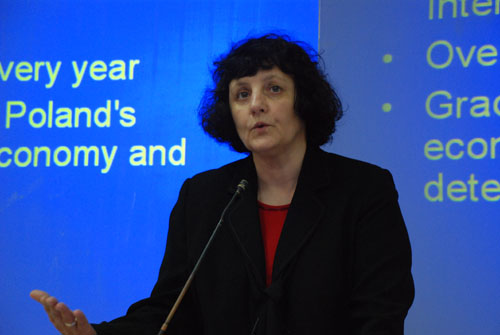 Elzbieta Kawecka 教授通过图表,展示了波兰的贸易平衡示意图等,形象地分析了波兰的近几年的经济发展状况。她还指出加入欧盟后,波兰的GDP得到了快速增长。欧盟资金的注入,也促进波兰经济的发展。