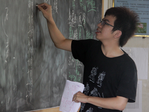 教学生辨别恼人的错别字,08西班牙语的胡路平有自己的一套方法。他在黑板上写含有常错字词的词组,让一个同学来填那个经常写错的字,再让另一个同学来做出判断并改正。课堂氛围十分活跃,大家都在座位上跃跃欲试。而当老师在台上点评的时候,大家也在欢笑中学习到了知识。接下来,数七游戏考验了一把大家的反应能力,也让课堂充满了欢声笑语。