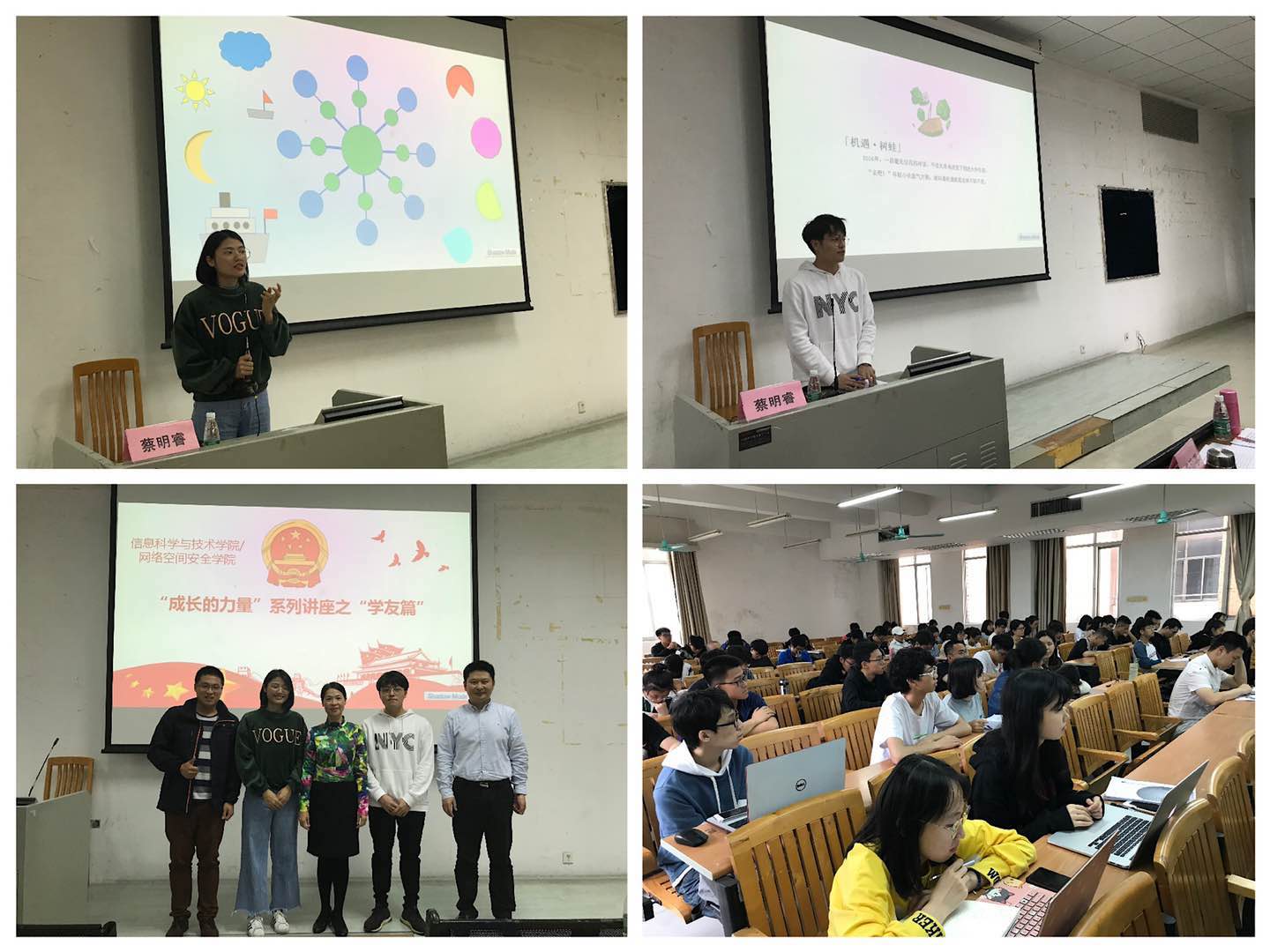 “学友篇”第一讲邀请国家奖学金获得者、2018级保送研究生龙晓岚和大三学生代表、seeing团队蔡明睿与全体大一学生分享。龙晓岚以“选择、陪伴、成长”为主题,与师弟师妹分享了自己本科和研究生阶段在信息学院的学习成长历程与收获。蔡明睿以“努力、坚持、自知”为主题,与大家分享了自己在数据挖掘实验室的成长和收获。参加讲座的学生纷纷表示,自己在与这些优秀的师兄师姐的交流和聆听中,收获了不少有用的知识,进一步激发了自己努力学习、刻苦钻研的意识和动力。第二讲邀请2015级优秀学生代表周智超、余秉权为大三备战考研的同学分享了自己的考研备考经验。周智超以总成绩第一名考入华南理工大学计算机专业,余秉权则考入同济大学,同样名列前茅。两位学长讲述了从选择学校、备考复习、时间分配到面试准备的整个考研流程,并对四门科目具体如何复习进行了深入浅出的剖析,以亲身体验建议师弟师妹们保持平时作息,加强身体锻炼,和同窗多交流,以自然的心态和顽强的意志奋战到最后。聆听讲座之后,大三的同学们纷纷表示,来自同龄人的倾心分享真诚而不失风趣,引人捧腹同时又发人深思,令备考学生受益匪浅。