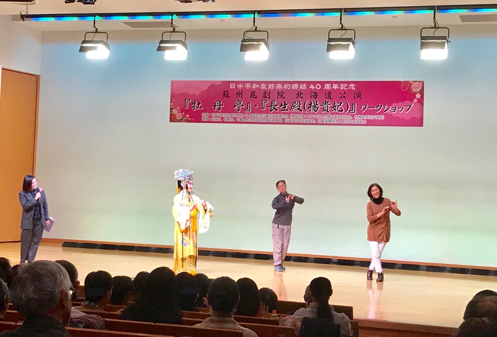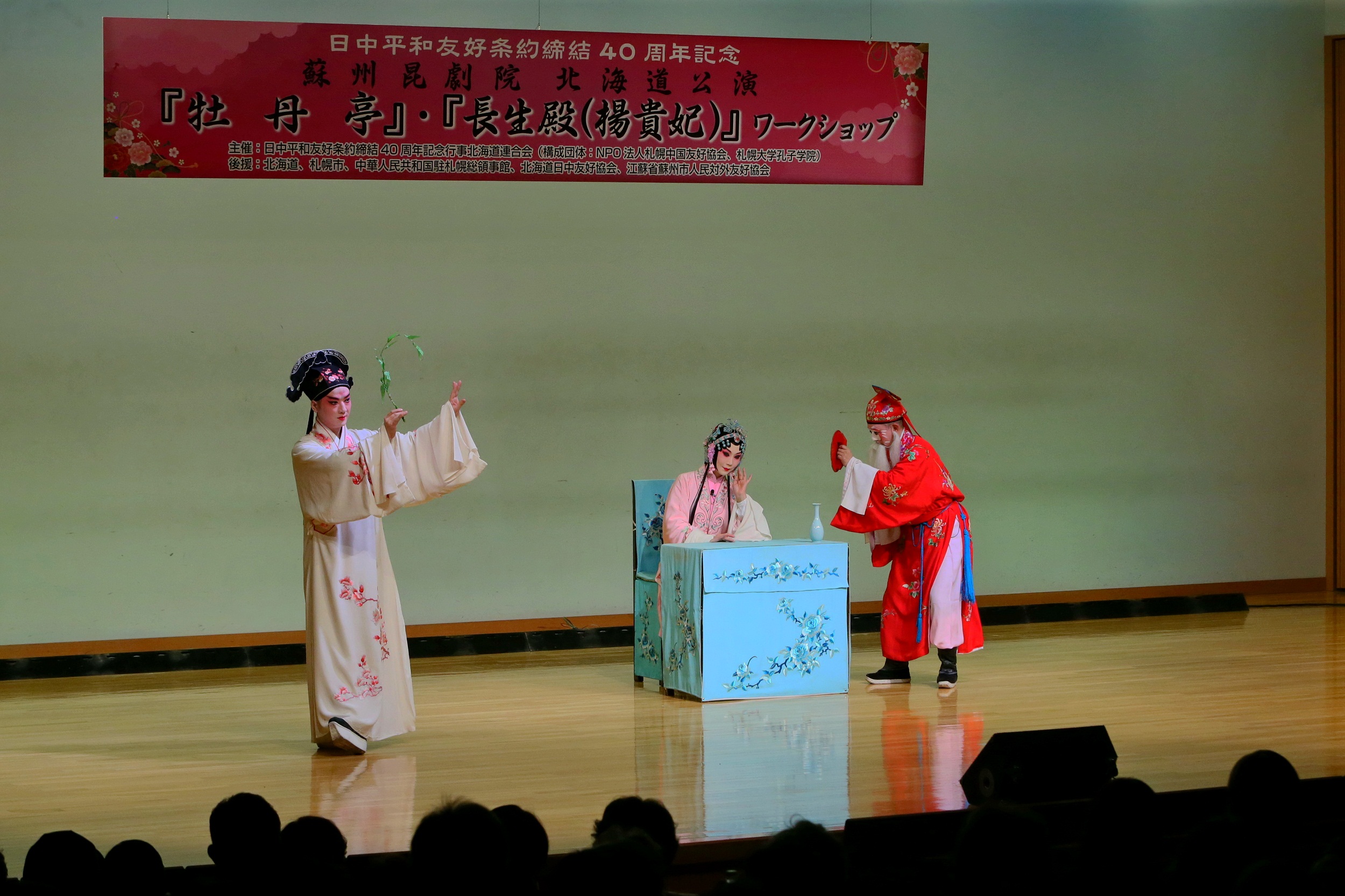 本网讯 为纪念中日和平友好条约缔结40周年,传承中日友好情谊,2019年1月12日,札幌大学孔子学院携手NPO法人札幌中国友好协会,在札幌大学联合举办了苏州昆剧院日本公演活动。由江苏省苏州昆剧院蔡少华院长带队,国家一级演员王芳、俞玖林等国家级优秀演员组成的《牡丹亭》剧组一行,为400多名札幌市民带来了一场昆曲文化视觉盛宴。当天虽然是鹅毛大雪,但剧场中还是座无虚席。