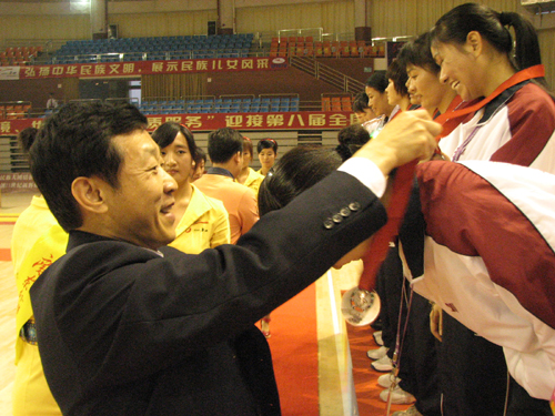 本网讯 11月17日下午,第八届全国少数民族运动会女子珍珠球项目的决赛在伟德bv国际体育南校区体育馆落下帷幕。最终北京队以35:32击败河北队,摘得本次珍珠球女子比赛的桂冠,河北队获得亚军,东道主广东队与四川队分列三、四位。国际大体联执委会罗马尼亚籍审计员艾德里安·噶吉莅临伟德bv国际体育体育馆观看决赛。校党委副书记许国彬也亲临现场视察工作,并在赛后的颁奖典礼上为获奖队伍颁奖。