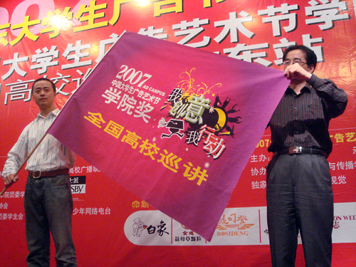 在互动环节送出各承办单位的礼品后,由杨先顺副教授将中国大学生广告艺术节学院奖全国高校巡讲的锦旗交付江苏站代表,宣告今晚活动的圆满结束。