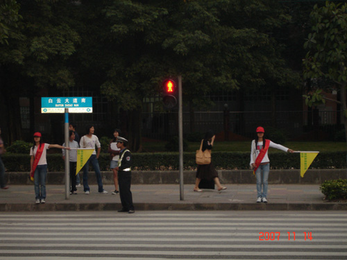 记者观察到,早在5点钟,车流量刚刚上升,就有几位志愿者来到自己的岗位上白云大道北的一处斑马线旁,开始参与指挥交通。只见她们循着红绿灯,不时地挥动旗子,并示意行人通行或留步。不一会儿,车流急剧增加……志愿者们在交警的指导下,在红灯亮起的瞬间举起手上的小旗,提醒过往的行人。由于正是下班和放学的高峰期,过往的车辆和行人都非常的多,公共汽车、大货车、小轿车川流不息,扬起滚滚烟尘,路人们都掩鼻匆匆避开,而志愿者们依然高举着小旗,紧张地注视着行人和红绿灯。记者站在马路旁半个小时内,已经有不少的行人在红灯亮起的瞬间依然想要横穿马路,但当目光接触到志愿者高举的小旗时便退回到斑马线内。
