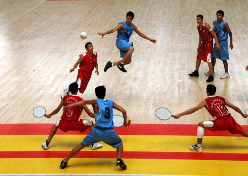 下半场一开始,双方比分交替上升。第2分钟,海南队8号队员将球从右路转移到埋伏在限制区前沿的11号队员,后者见缝插针,一记反弹球从对方两名持拍队员中间穿过,为海南队拿下两分。广东队同样不乏亮点,下半场第4分钟,广东队5号刘振武带球刚过半场,声东击西地将球直线射出,持抄网队员也心领神会,将球轻松接住,23:13,广东队将比分差距扩大到两位数。