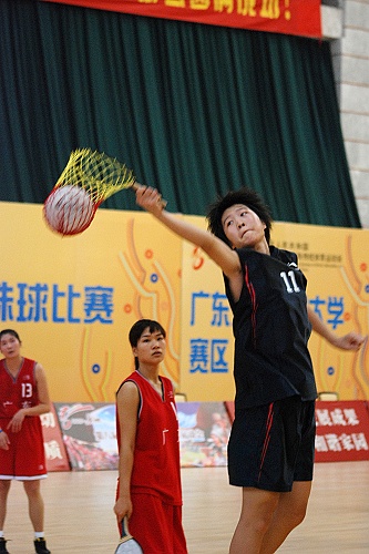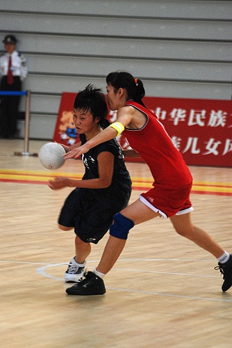 此前,广东队和河北队皆是以小组赛第二的身份进入四强。两队实力相当,一开场比分就紧咬不下。河北队持抄网队员利用身高优势,屡屡抄球入网。15号队员张明慧虽然身高不占优势,但穿插灵活,助攻队员从右侧得分。河北队渐渐将比分拉至17:12。经过暂停调整后,广东队马上跳投得分。河北队随即也回敬一球。接着广东队加强了进攻和抢断,其中11号梁国萍欲浑水摸鱼,无奈球过高,得分无望。随后,广东队进攻队员从对方防守队员中间投球,反弹入网,把比分追至16:19。河北队也不毫不放松,试图扩大比分,但上半场终以19:16,河北队领先3分的优势结束。