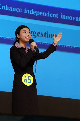 当晚出现了大赛举办以来第一次有两支决赛队伍讲介同一个公司,来自国贸2班的E组也选择了“真功夫”作为讲介公司。“How to make a second breakthrough”是他们贯穿讲介的主题,从产品发展和品牌文化两个方面进行分析,他们提出一系列别出心裁的创新方案。当他们提出“在餐厅内建立‘Mini Kitchen’来营造家的感觉,吸引顾客”这一富有创意的想法之后,全场观众为之折服,爆发出雷鸣般的掌声。