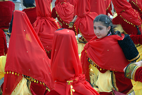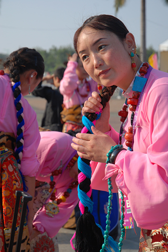西藏艺术团的一名女演员正在扎辫子:人面粉衣相映红。