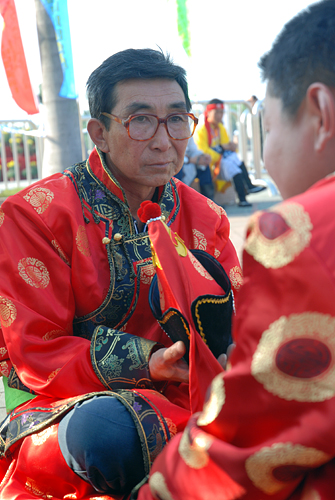 马背上的民族——蒙古族:身着盛装的选手们在讨论马术比赛。