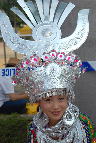 侗族姑娘佩带着美丽的银头饰,笑靥如花。