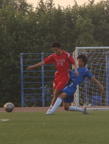 首先由中文队员主罚。中文队第一个上场的是26号钟志坚,他的射门太过正中被新闻门将单拳打出。