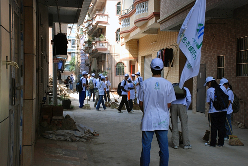 除了派发传单和宣传环保知识之外,志愿者们还身体力行,为横江区的市民义务打扫街道,清理墙壁上不符合规定的传单、海报等。志愿者陈同学说:“虽然我们能做的事情不是很多,但我真的希望我们的精神能够感染到其他的人,一起行动起来创建卫生家园。”