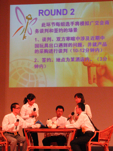 在第二环节中,选手们分饰广交会中玩具出口的买卖双方,按照组别依次进行了采购谈判和签约仪式的情景模拟。