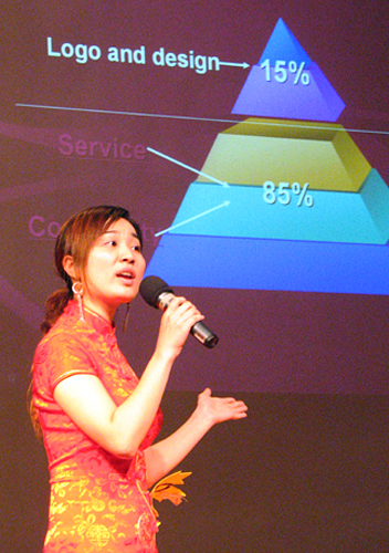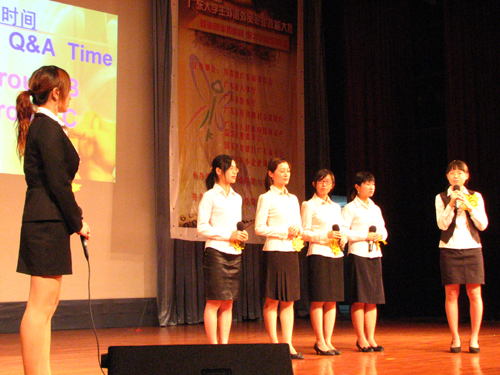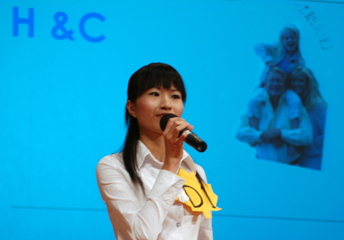 最后上场的D组开场便以整齐的鞠躬和响亮的问好赢得了评委及各位来宾的掌声。D组选手主要针对老人的健康护理,为自己的公司H&C做了详细的讲介。该组讲介主要分为市场分析、产品介绍和客户服务三部分。
