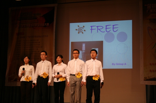 最先登场的是A组,介绍的产品是FREE润肤霜。该组分工明确,除了有产品介绍、市场分析、营销策略这几个基本部分以外,A组4号选手还专门对售后服务和信息反馈的情况进行讲介。在讲介后的问答环节中,5号选手赵炼圳在回答D组选手提出“该商品如何与国际品牌商品竞争”的问题时,观点鲜明地强调了他们的产品的价钱适中,而且富含天然茶树油等优点,礼貌而自信,赢得了现场观众的阵阵掌声。