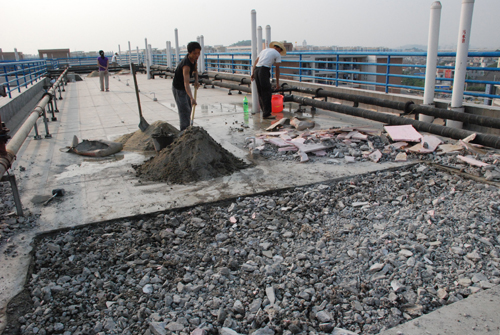 10月29日中午,记者来到11栋天台。只见天台地面被挖了好几个长方形大坑,周围乱堆着沙石、水泥和瓷砖,三位师傅正在贴瓷砖。据他们介绍,这些大坑是其他师傅早前挖好的,现在他们只负责用沙石把坑填好,再铺上瓷砖。之前因为结构不合理,导致雨水渗透到地板夹层中,进而导致天花板漏水。现在的工序是计划的维修工程的最后一道程序,如果还是出现天花板漏水的现象,他们会继续跟进。他们表示,前几天已修理好11栋的天台,待完成9栋的工作后会继续到8栋施工。