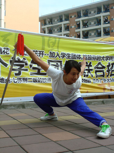 伴随铿锵有力的歌曲,武协以精彩的武术表演吸引了大群同学围观。他们舒展大方、动迅静定的长拳,柔和舒缓、圆活自然的太极拳等拳种,以及刀、枪、剑、棍等器械套路表演,博得了阵阵掌声和喝彩声。