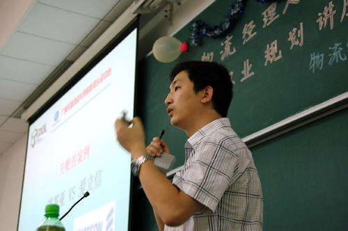 本网讯 9月28日晚,由物流协会举办的物流经理人职业规划讲座在南校区教学楼F514举行。担任宝供物流企业集团华南区销售经理与广州天圆物流与采购教育认证中心的讲师的燕鹏飞给在场的同学上了精彩的一课。出场的嘉宾还有叶春黎讲师、国际工管学院的王刚老师。