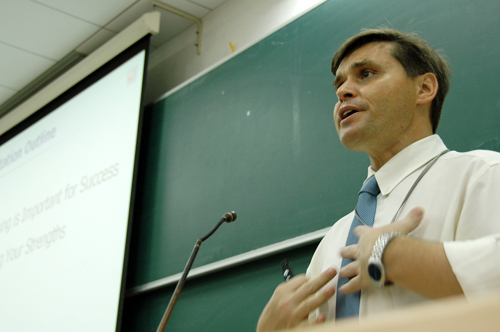 首先,Philip Teal先生强调了有一个清晰的梦想对一个人成功的重要性,并且列举了爱因斯坦、贝尔等著名人物的例子来说明梦想是事业的起点,梦想是成功的渠道的观点。Philip Teal先生非常信奉“知己知彼,百战不殆”的道理,他认为一个人想要成功首先要设定自己的职业目标,从内心深处了解自己的人生方向,然后确定职业发展的渠道。Philip Teal先生建议,作为大学生,应该广交良友,不断拓展自己的人际关系网络,用network relationship的观点来全面发展自己。他补充说我们要对自己的每一小步发展做出肯定。也就是“庆祝成功”,用这种方法来不断强化内心对成功的强烈渴望以及积极汲取知识的热情,这种与传统的职业指导理论略有不同的创新之说引起了同学们的兴趣。