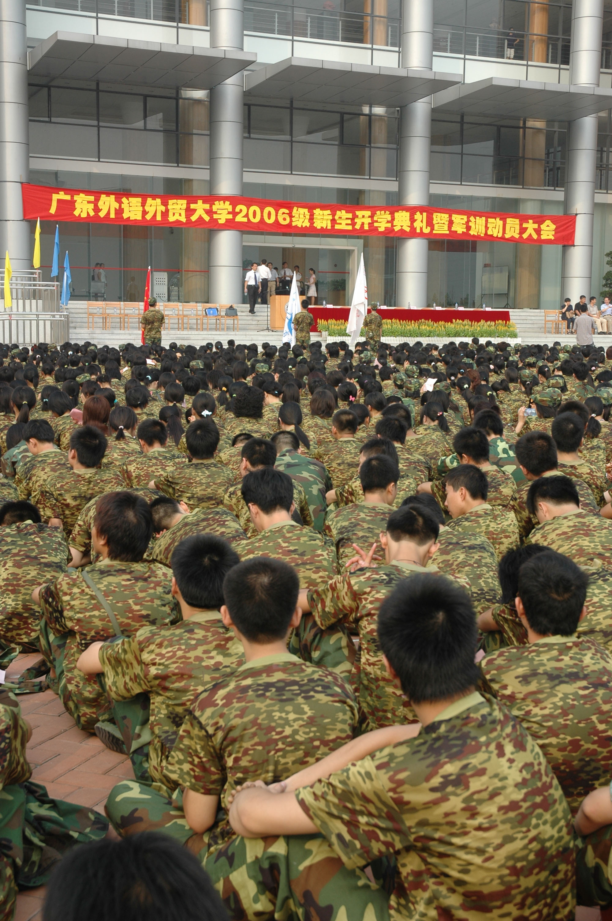 2006年,大学城二期工程基本完工——图书馆和艺术楼已建成并投入使用,博雅园、风采园都“开饭”了,7、8、9、10、11、13栋都已陆续有学生入住……整个广外大南校区的基础设施基本完成,但仍不是完整——去年田径场南边的球场还未建成,而06级新生军训旅三营九连七排的同学们就在球场的建筑工地上军训。