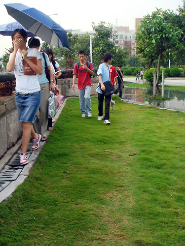 “好臭啊……”经过广外站通往教学区路段的行人纷纷抱怨。经贸学院的黎同学告诉记者,下水道涌水现象大运会期间就已经出现,草地和路面浸水遇到下雨天就更加严重。她说:“每次要从车站到教学区都很不方便,尤其是晚上,一不小心就会踩到污水!”