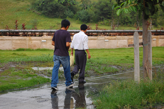 为了避开恶臭的水渠和保护绿地,同学们走上狭窄的“水泥路”