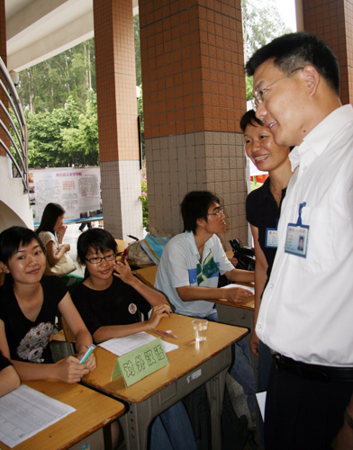 一名志愿者,为多名新生服务着