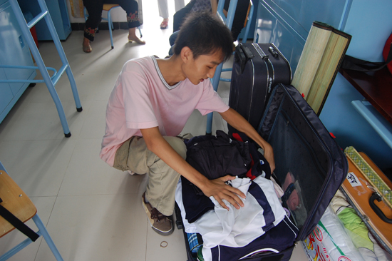 一个人,一大堆行李,网络工程专业的苏达同学就这样来到了广外,一下包车,已经有志愿者上前帮他将行李集中看管。在志愿者的引导下,他前去信息学院的新生接待处领取新生档案。报到期间出现了一个小插曲,苏达原以为来校不需要录取通知书,将它放在家中忘了带来,并因此不能领取一部分档案。看到他很焦急,负责接待的志愿者急忙安慰他,请他出示自己的身份证等有效证件,在检查无误之后将宿舍的钥匙交给他,让他先去登记住宿,安放行李,然后告诉他让家中把录取通知书快递过来,苏达这才松了一口气。接着两位同学帮他将行李送上了四楼,并为他看管行李。收拾好床铺以后,苏达接到了一个电话,原来是他的同学也到了,让他下去帮忙搬行李,于是他把未收拾好的行李放下,又跑了出去,只留下一串忙碌的背影。