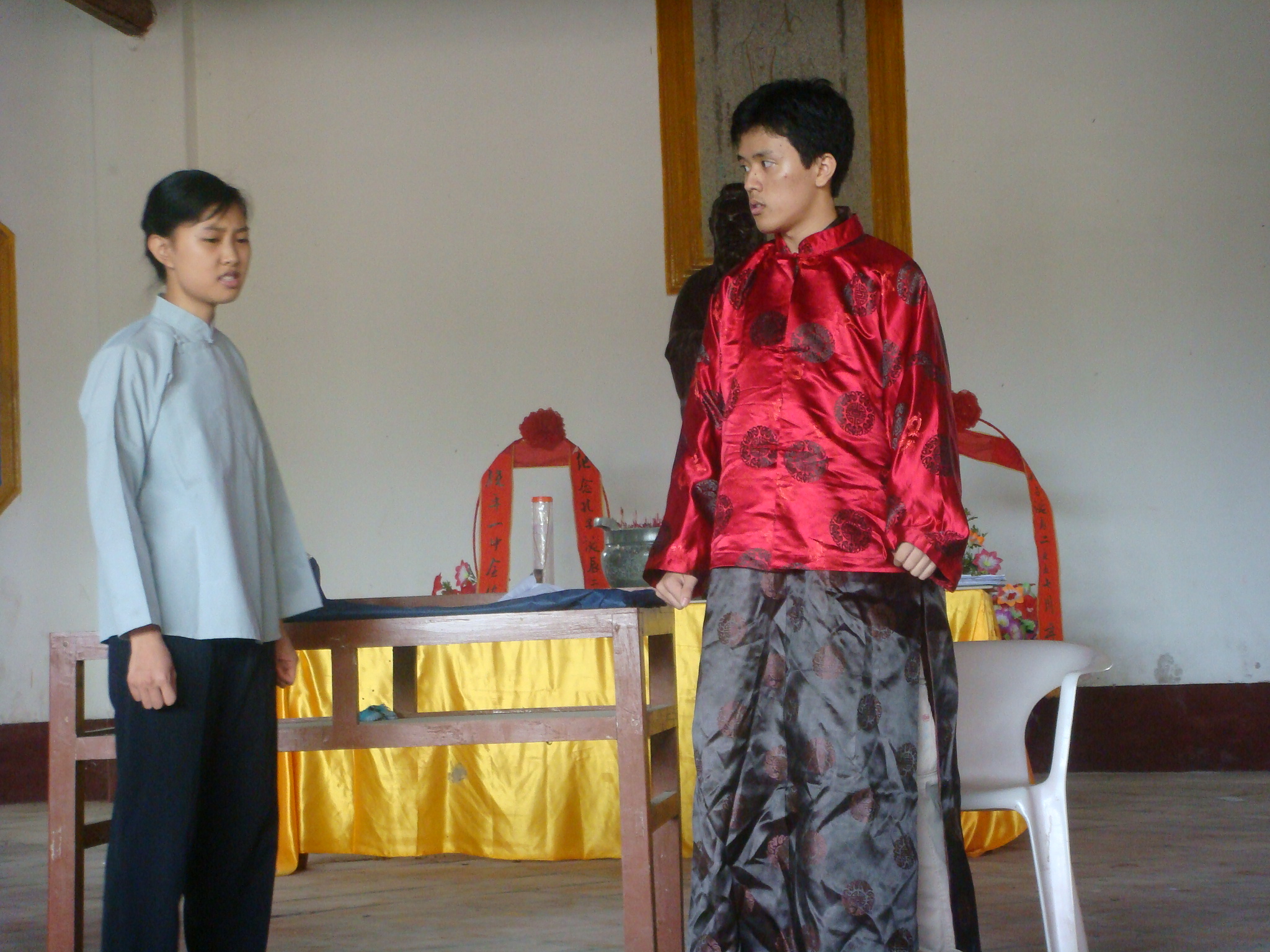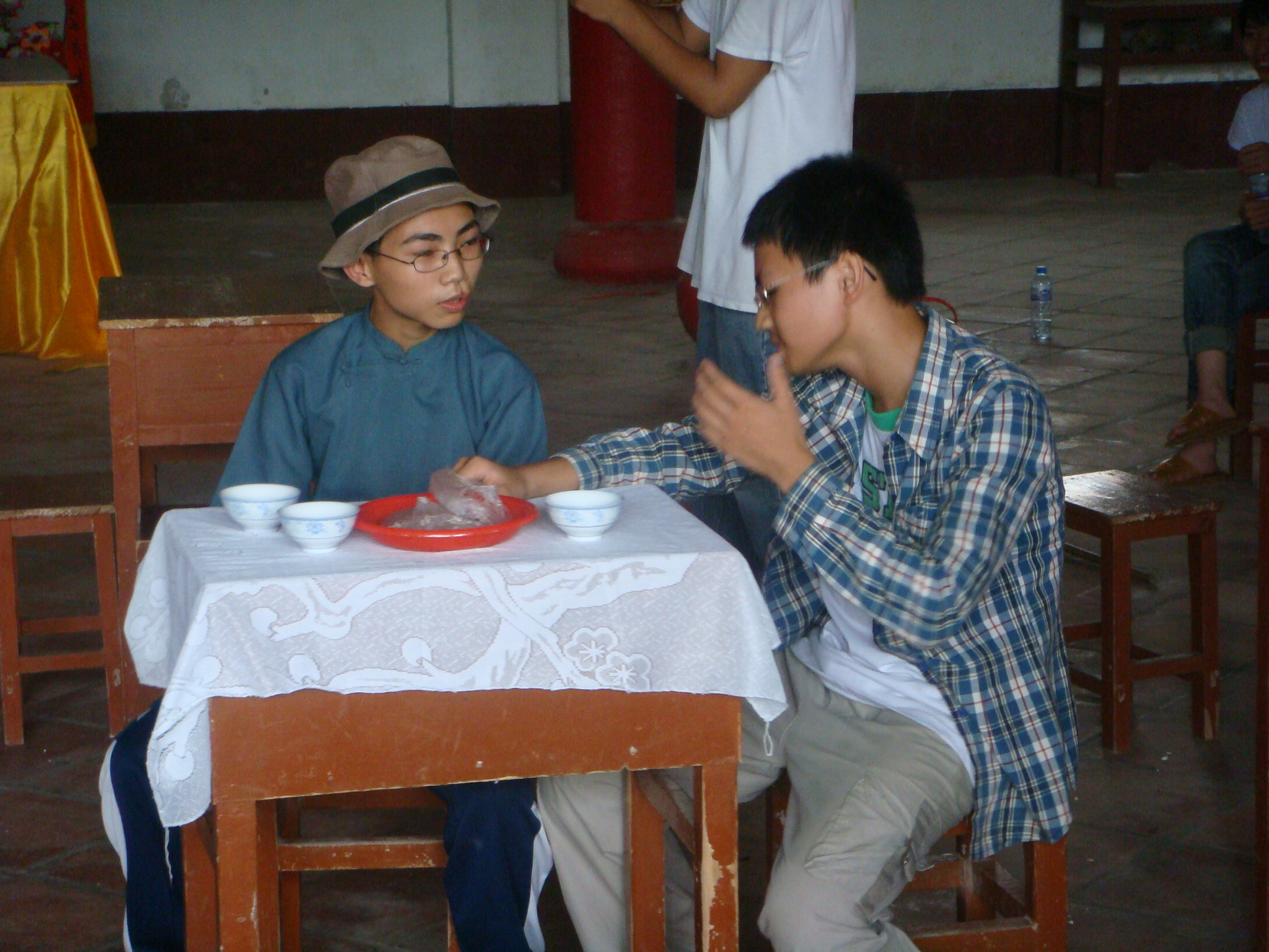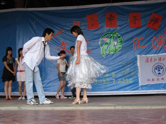 在掌声和赞扬声背后,我知道他们付出了很多很多。从拿到剧本到能够自如地表演,其间不过是短短五天。尽管剧本长达十多页,他们却自觉利用课余时间去记下来,并很快就能在排练中脱稿了。他们还很有创造性地对剧本进行了修改,准备了齐全的道具,大到桌椅,小到布景摆设,他们都一一考虑到了。