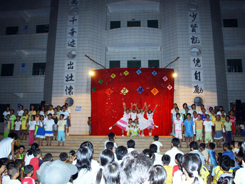 三年级的合唱,稚气的声音感染了在场的每一个人,掌声随歌声和着;五年级的舞蹈,虽然略显生硬,但那份真诚已经让每个人痴迷;六年级的小品,小演员用雷州话和普通话两种语言向我们演绎精彩的片断,那阵阵笑声肯定了他们的表演;六年级的健美操,青春舞动,活力四射,场上一片沸腾;还有村委和校长的独唱,悠长回旋,体现了这里人对歌唱的热爱。
