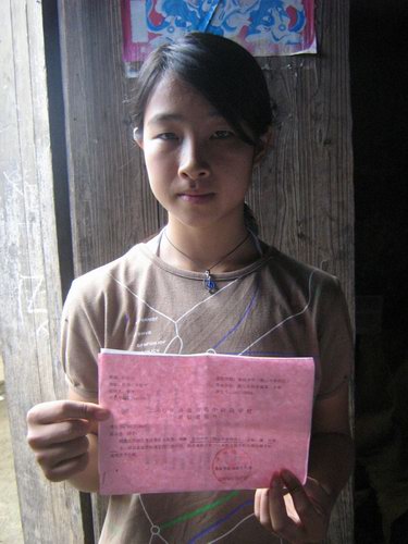 这小女孩名叫陈金莲,今年刚以优异成绩考上清远市南阳中学。但是因为家庭的经济问题,她已经错过了新生注册的时间。她很渴望读高中,眼看九月开学时间就要来临,金莲焦急万分。她家也是急切要迁移出东山的农户之一,为了攒足钱在清远买房子,哥哥和姐姐都已经辍学在外打工。连同爸爸妈妈,全家有经济收入的四人最大的愿望就是搬离东山。金莲因为自己是女儿,不敢跟家人提出要继续读书的要求。摆在小金莲面前只有两条路,一是不提起要读高中的事,跟家人一起追逐迁移梦;二是要求家人供自己上高中,让家继续留在东山。当她手持录取通知书跟我们交谈时,她的眼神充满矛盾。