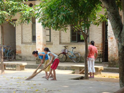 认真地打扫每一片落叶。专注的神情,灿烂如花。乖巧的小孩,善良的小孩,回家以后还有很多家务活要做,但她们却开心地告诉我们说:我们很乐意做这些打扫!