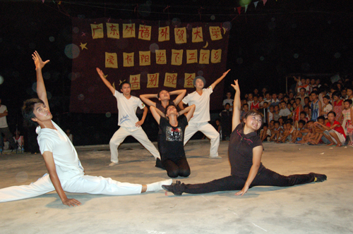 在一片小小的空地,临时搭建而成一个小小舞台,使这个宁静的村庄,此刻活力四溢。明天我们的队伍将踏步晨曦,告别这片藏有美好回忆的土地。在即将告别之际,我们特意精心准备了一台丰富的演出。