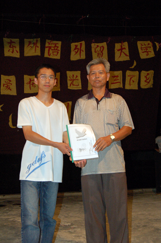 晚会中场,还举行了一项爱心捐赠仪式。为了更好地提高该校的英语教学水平,我队充分发扬本校英语优势,从实际出发,针对该校学生的英语水平,编写了一份特色英语教学模式,赠与该校。