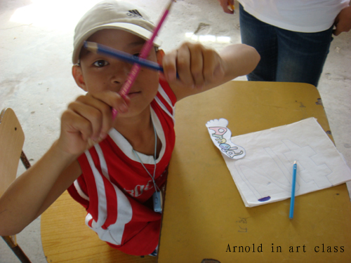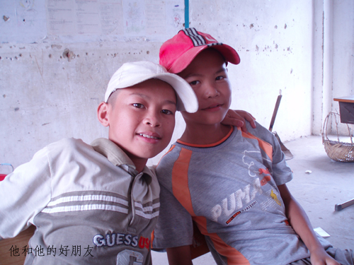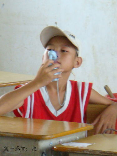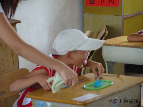 第一次与他见面是在“三下乡”第三天的班会课上。当时四年级的同学们正在班主任的带领下学习班歌。悦耳的歌声充满了整间课室,还从破烂的窗户传到了隔壁的课室里,吸引了很多五年级的学生在窗外看热闹。这时,一个穿着红色的火箭球衣,戴着白色的鸭舌帽的小男孩,突兀地闯进了四年级的课室,瞪大眼睛,大声地用恩平话对我说了几句,小手指了指四年级小朋友桌上的歌词,继续嚷着听不懂的恩平话。虽然听不懂他说什么,但从他的眼神和动作中,我猜到他也想要一份歌词。我担心他回因为拿不到歌词在课堂上捣乱,于是把手上仅存的一份给了他。他拿着歌词,兴高采烈地离开了四年级的课室。看着他瘦小的背影,我脑海中只留下了他那瞪得大大的眼睛以及那句吆喝似的恩平话。这个孩子一定很难教,我不禁想道。