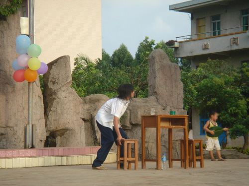 今晚的甜品以成语作主料,《揠苗助长》、《郑人买履》和《杯弓蛇影》入选;学生们如夏日骄阳的激情便是佐料。他们的表演惟妙惟肖,配音妙趣横生。表演道具更是五花八门:衣架、胡子甚至池塘的清水都派上了用场。
