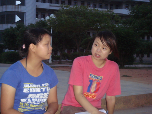 在宿舍,我们经常会接待一些过来探望的学生。一句“我们只是想上来跟老师们说一说英语”体现了她们对于学习英语的热情和渴望。问到她们的理想大学时,脱口而出的是“北大”、“清华”甚至是“哈佛”等世界知名学府。她们都觉得摆脱贫穷,走出这片山村的唯一道路就是考上一所好大学。有一次,其中一名同学却皱起了眉头,她小声地询问身边的老师关于大学费用的事情,她不想给原本已经经济拮据的父母增加负担。这时我们才意识到在她们小小的心中有着远大的理想,但也有无奈。为了重燃她们进大学的希望,我们细心地跟她们描述多姿多彩的大学生活,并解释有关助学贷款、勤工助学和奖学金等政策。此时,女孩脸上重现了自信的笑容。