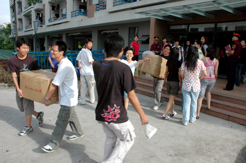 7月1日上午六点半,天已大亮,搬迁工作正式开始,大家忙着把一箱箱行李搬到校道上,等候运货车,七栋八栋宿舍楼下面人群熙熙攘攘。保卫办派出十名校卫队员,六点半准时到岗,在行李区巡逻,维持现场秩序,甚至常常帮忙搬运行李。